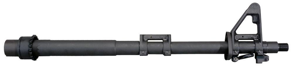 Similar to our M4 profile Dissipator Barrel, this offers our Heavy Profile turning. Rifle length sighting improves accuracy while retaining a carbine length barrel’s ease of handling. A low profile gas block functions in the carbine position and a full A2 front sight base is positioned at rifle length with a triangular handguard cap, sling swivel, front sight post, front sight detent, and bayonet lug included. It also includes the Barrel Extension with M4 Feed Ramps. This premium barrel is machined from 4150 Chrome Moly Vanadium 11595E Steel, Chrome Lined in both Bore and Chamber for long wear and ease of cleaning and Black Manganese Phosphate finished for protection against rust and corrosion. Button rifling (1 turn in 9 inches – right hand twist) offers optimum accuracy with a wide range of .223 / 5.56mm ammunition. The muzzle is threaded 1/2” x 28 T.P.I. to accept a variety of flash hiders or muzzle brakes.