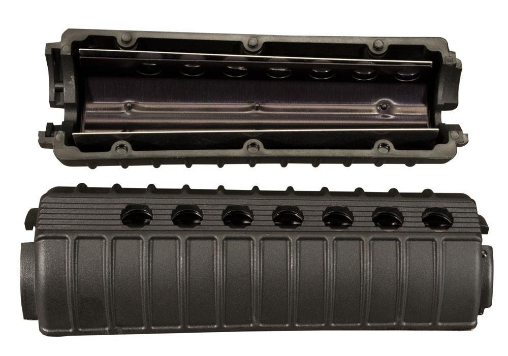 These are the heavy duty, oval shape M4 Carbine type Handguards. They feature black finished, dual aluminum heatshields and are molded of heavy black plastic. The mirror image design allows either piece to be fitted – top or bottom – on the rifle.