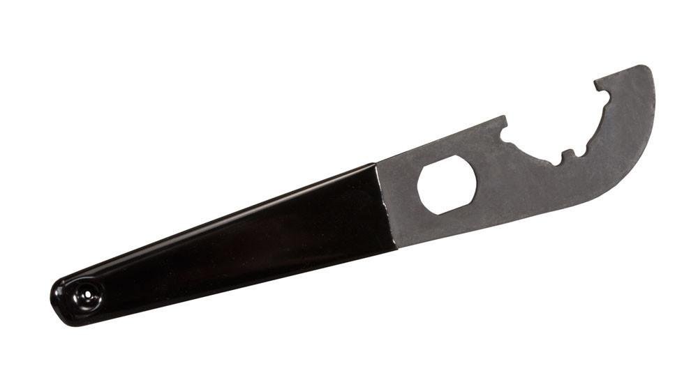 An essential tool for the armorer or AR Carbine owner, this dual function steel Telestock Wrench will quickly tighten or loosen the castellated nut that locks the Telestock to the Receiver. It includes a cutout that fits the end of the receiver extension tube on a standard A2 stocked rifle, and the handle is plastic dip coated to make use more comfortable. Machined from black manganese phosphate coated steel – made in the U.S.A.